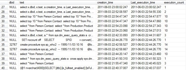 select x.dbid, x.text, a.creation_time, a.Last_execution_time, a.execution_count from sys.dm_exec_query_stats a cross apply sys.dm_exec_sql_text(a.sql_handle) x go