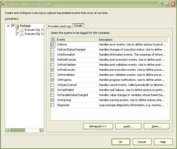 4. Switch to the Details tab and select the events you want to log and audit. Click OK, save your SSIS package and your logging is enabled.