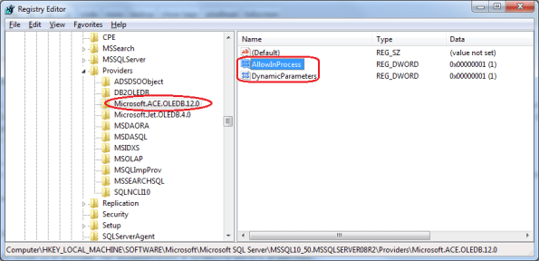 A new folder entry is made for “Microsoft.ACE.OLEDB.12.0” provider.
