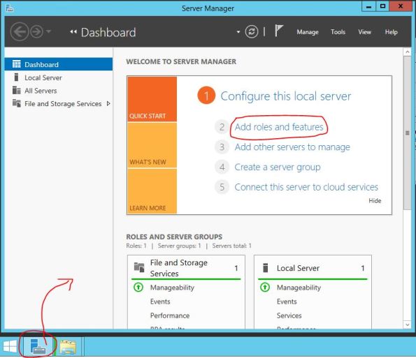 This feature can be installed from the “Windows Server Manager”, you will see its icon on the task bar besides the Start button, as shown below. Or you can directly type “servermanager” on CMD or Run prompt.