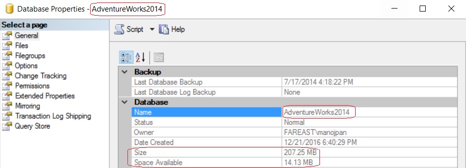 – The 1st image shows the size of original AdventureWorks2014 database i.e. 207 MB