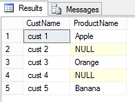 SELECT C.CustName, O.ProductName FROM dbo.Customer C LEFT JOIN ( VALUES (101, 1, 'Apple'), (102, 3, 'Orange'), (103, 5, 'Banana') ) AS O (OrderID ,CustID, ProductName) ON O.CustID = C.CustID