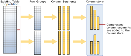 The ColumnStore or Columnar data format does not store data in traditional RowStore fashion, instead the data is grouped and stored as one column at a time in Column Segments.