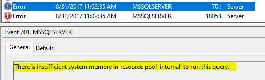 Error: 701, Severity: 17, State: 65. There is insufficient system memory in resource pool ‘internal’ to run this query.