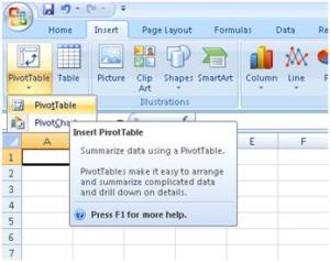 Click on sheet2 and click on Insert tab and select PivotTable from the drop-down menu as shown in window below.