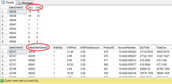 -- Using IDENTITYCOL at WHERE clause and ORDER BY clause: SELECT * FROM [Sales].[SalesOrderDetail] WHERE IDENTITYCOL <= 100 ORDER BY IDENTITYCOL -- Using IDENTITYCOL with COUNT() function instead of the original column name & with Column name separately: SELECT SalesOrderID, COUNT(IDENTITYCOL) AS Cnt1, COUNT(SalesOrderDetailID) AS Cnt2 FROM [Sales].[SalesOrderDetail] WHERE ModifiedDate BETWEEN '01/01/2006' AND '02/01/2006' GROUP BY SalesOrderID -- Using IDENTITYCOL at column level and at JOIN's ON clause: SELECT D.SalesOrderID, D.IDENTITYCOL, D.OrderQty, D.UnitPrice, D.UnitPriceDiscount, [ProductID], H.AccountNumber, H.SubTotal, H.TotalDue FROM [Sales].[SalesOrderDetail] D INNER JOIN [Sales].[SalesOrderHeader] H ON H.IDENTITYCOL = D.SalesOrderID WHERE H.OrderDate BETWEEN '01/01/2006' AND '02/01/2006'
