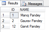 -- So we will remove the ContactID column as we want to have new ID column. SELECT IDENTITY (INT, 100, 5) AS NEW_ID, Title, FirstName, MiddleName, LastName, EmailAddress, Phone INTO #tempTable FROM Person.Contact -- This worked perfectly. -- Now let's check the newly created temp table and inserted records: select * from #tempTable -- Output below shows selected records from Person.Contact table with a new column having values starting from 100 with a gap of 5: