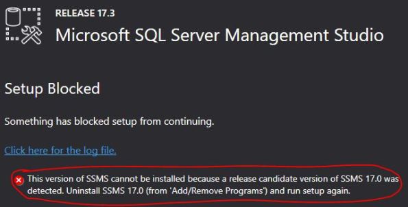This version of ssms cannot be installed because a release candidate version of ssms 17.0 was detected.