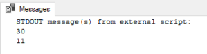 EXEC sp_execute_external_script @language = N'Python', @script = N' x = 5 y = 6 a = x * y b = x + y print(a) print(b)'