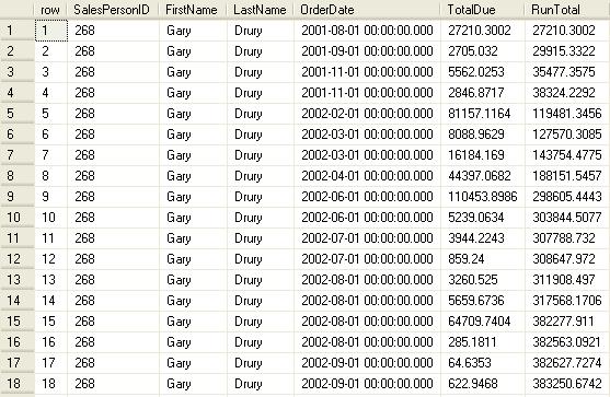 USE [AdventureWorks] GO -- Method 1: (Query Cost 9%) ;with RunTot as ( select row_number() over(partition by s.SalesPersonID order by s.OrderDate) as row, s.SalesPersonID, p.FirstName, p.LastName, s.TotalDue, s.OrderDate from Sales.SalesOrderHeader s join Person.Contact p on s.SalesPersonID = p.ContactID) select a.row, a.SalesPersonID, a.FirstName, a.LastName, a.OrderDate, a.TotalDue, sum(b.TotalDue) as RunTotal from RunTot a join RunTot b on a.SalesPersonID = b.SalesPersonID and a.row >= b.row group by a.row, a.SalesPersonID, a.FirstName, a.LastName, a.TotalDue, a.OrderDate order by a.SalesPersonID, a.row -- Method 2: (Query Cost 91%) ;with RunTot as ( select row_number() over(partition by s.SalesPersonID order by s.OrderDate) as row, s.SalesPersonID, p.FirstName, p.LastName, s.TotalDue, s.OrderDate from Sales.SalesOrderHeader s join Person.Contact p on s.SalesPersonID = p.ContactID) select row, SalesPersonID, FirstName, LastName, OrderDate, TotalDue, (select SUM(TotalDue) from RunTot b where b.SalesPersonID=a.SalesPersonID and b.row<=a.row) as RunTotal from RunTot a -- Output Listed below:
